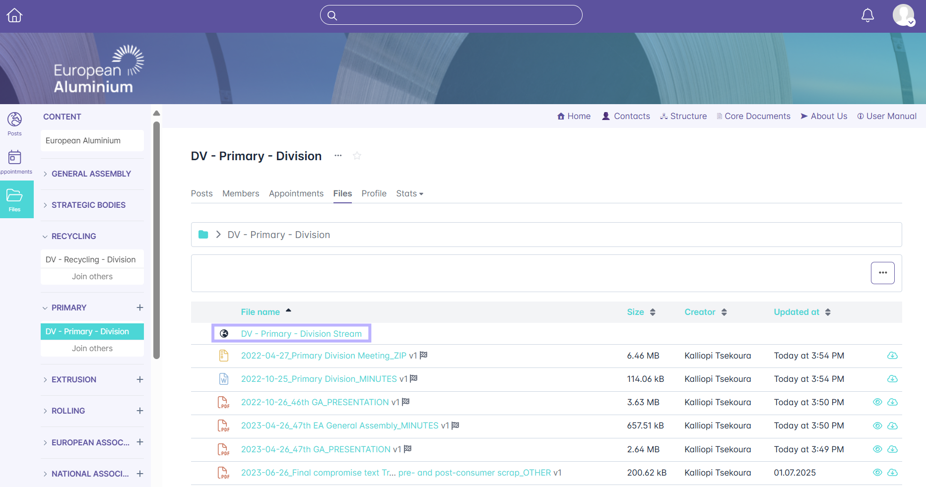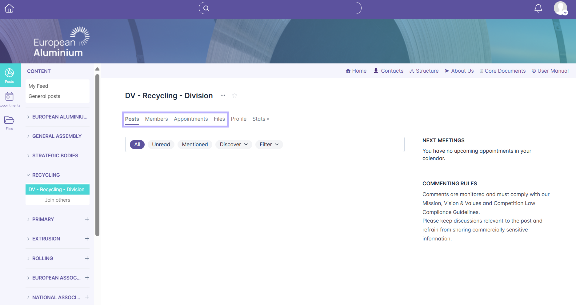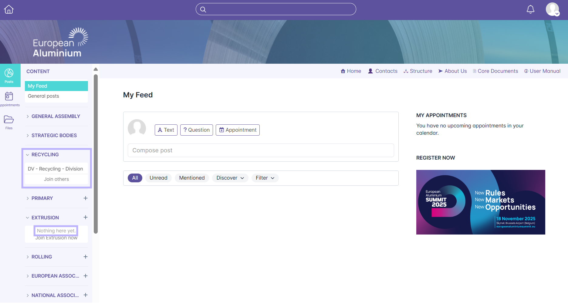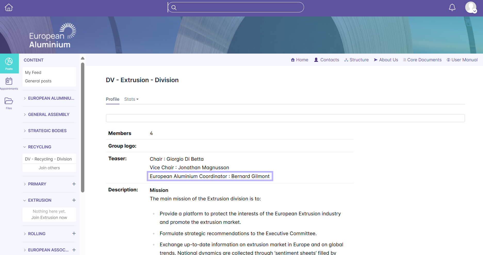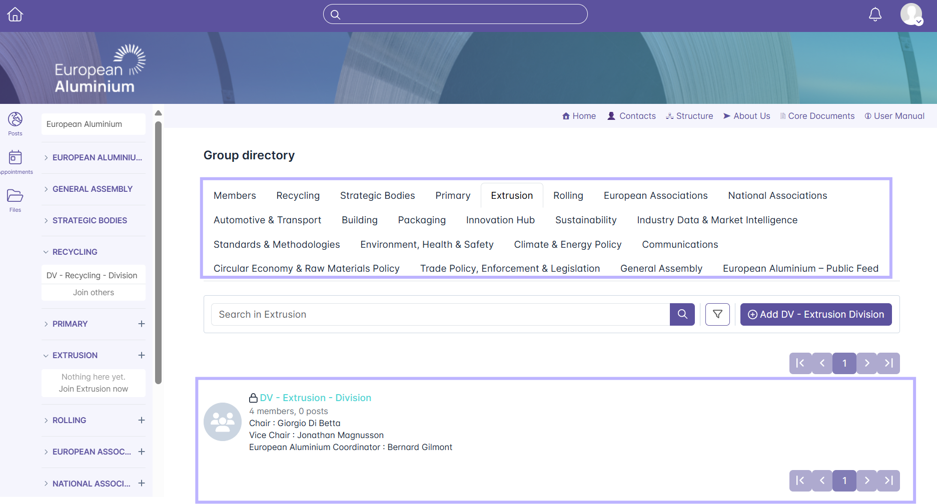 Each group has its own page, where you’ll find the name of the group coordinator listed at the top. If you’d like to join a specific group, you can contact the European Aluminium coordinator via email to request access.
